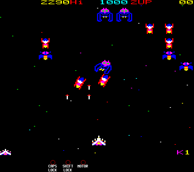 Probably my favourite of the "Space Invaders" genre games, with the exception of Zalaga (below) which is more trouble to get working because of it's use of undocumented 6502 op-codes.